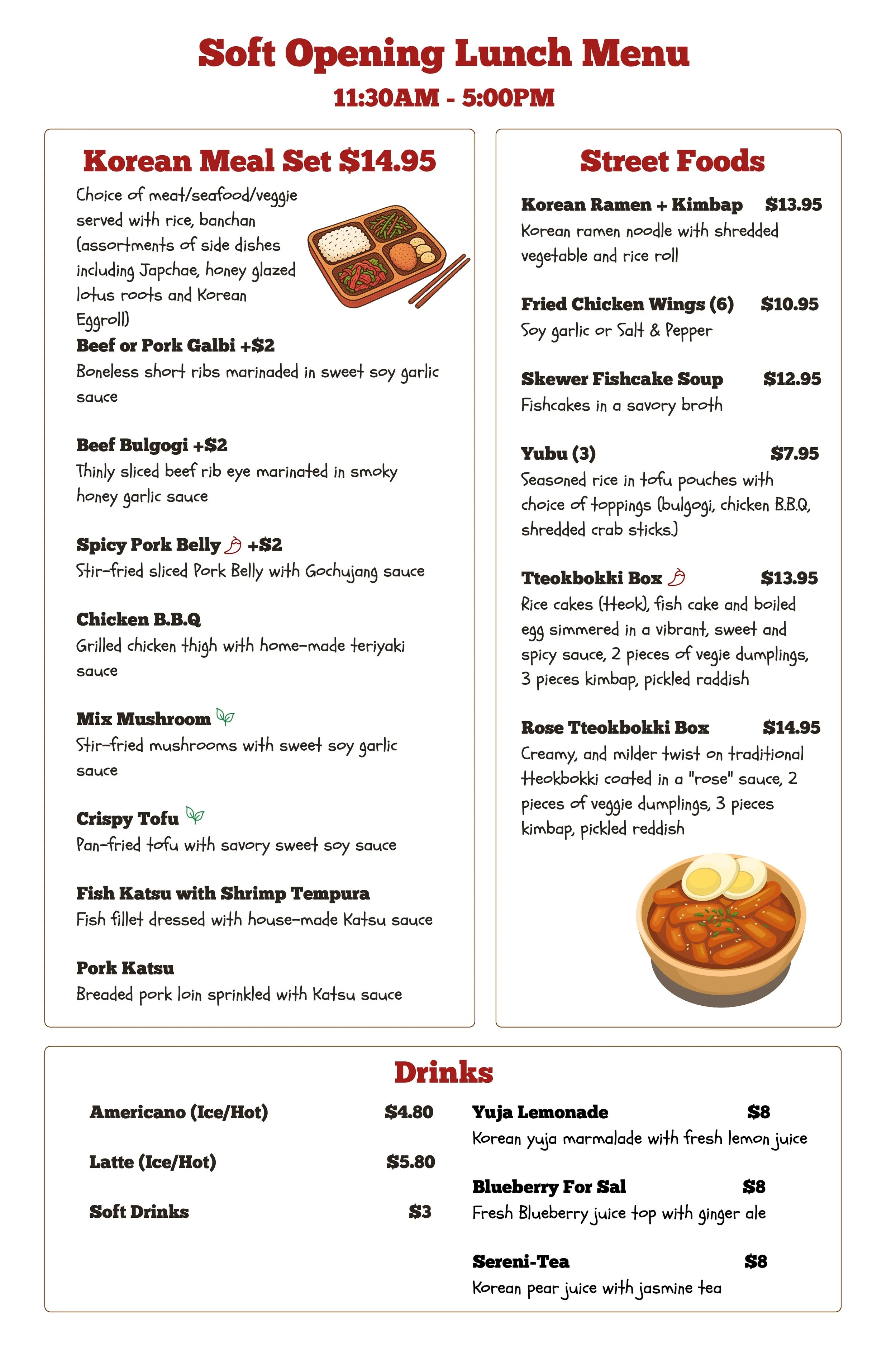 Thinly sliced beef sirloin marinated in smoky honey garlic sauce, served with rice, banchan. Assortments of side dishes including japchae, honey glazed lotus roots and Korean eggroll.