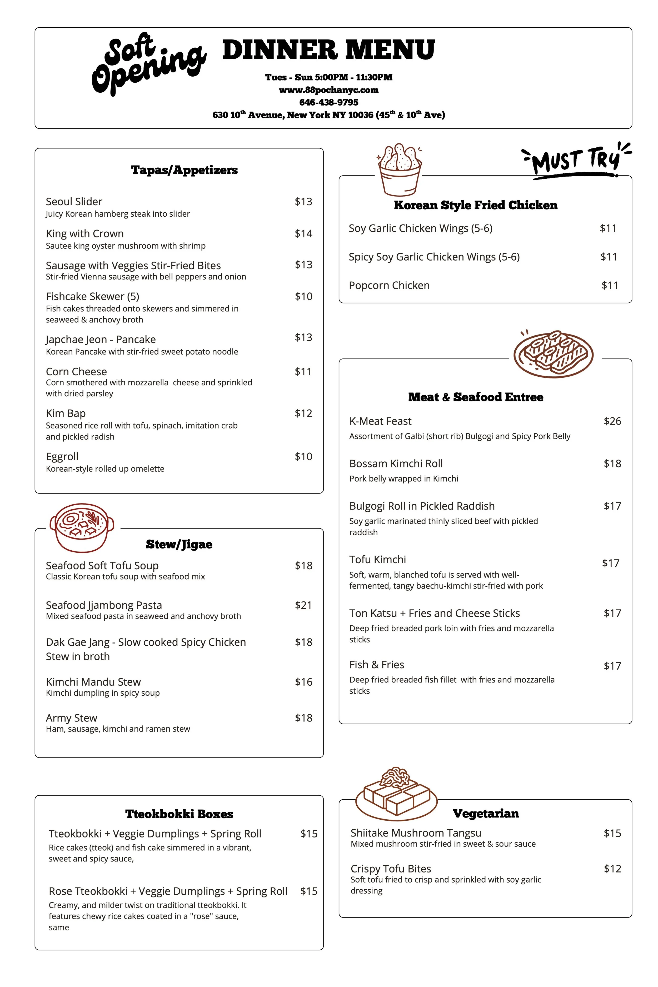 Pan-fried crispy tofu with savory sweet soy sauce, served with rice, banchan. Assortments of side dishes including japchae, honey glazed lotus roots and Korean eggroll.